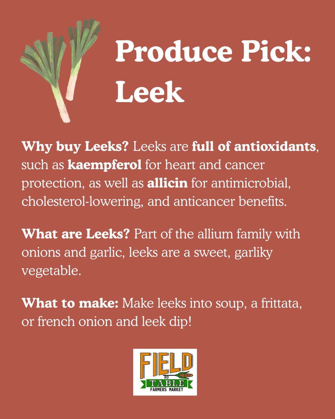 This week’s Produce Pick is the infamous Leek! A delicious vegetable to have in soup, dip, and more!