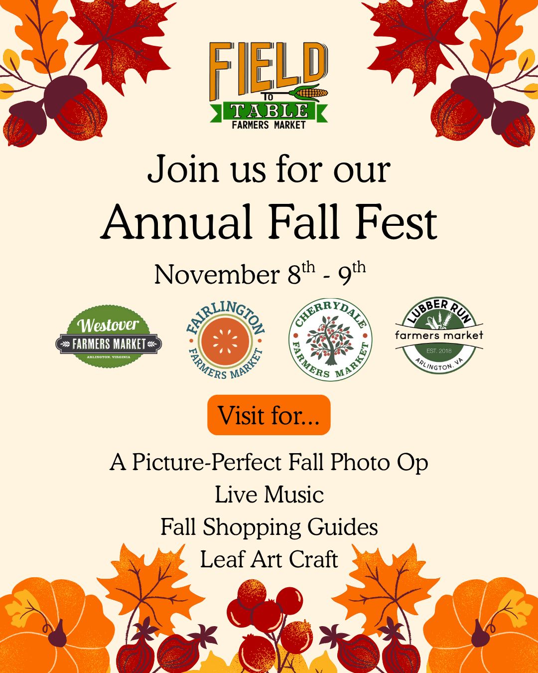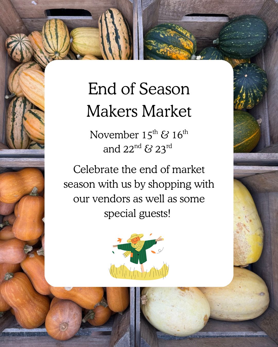 All markets: Fall event updates! Read on to learn about Annual Fall Fest (Nov. 8th-9th) and our End of Season Makers Market (Nov. 15th & 16th and 22nd & 23rd)