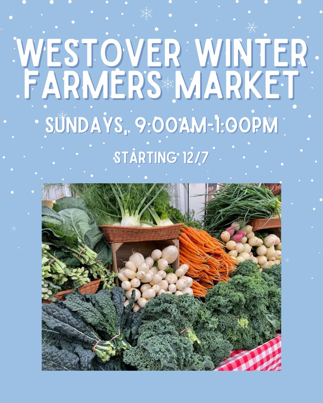 Westover Farmers Market will be transitioning to our winter market schedule and vendors on December 7th. There is no break between seasons and our hours will be 9:00am-1:00pm.