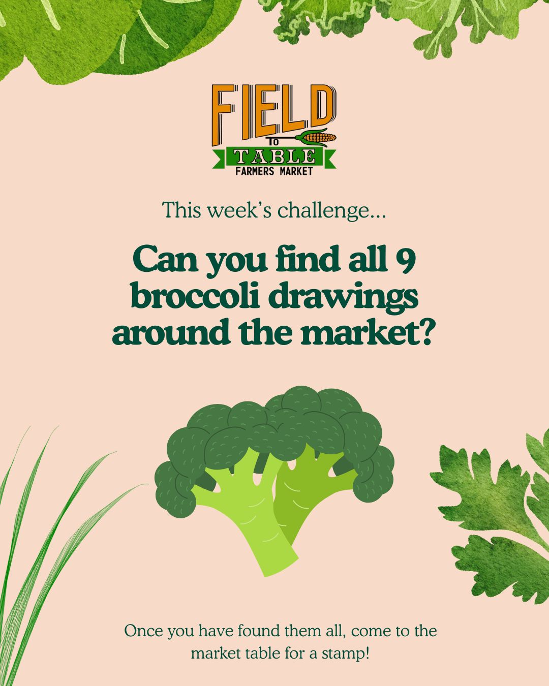 Each week, we post a challenge for you all to find chalk drawings of fruits or veggies scattered around the market. Find all of them, and come to the market table for a stamp on your punch card (provided there). Once you get 6 stamps (you get one per week), you get a prize!