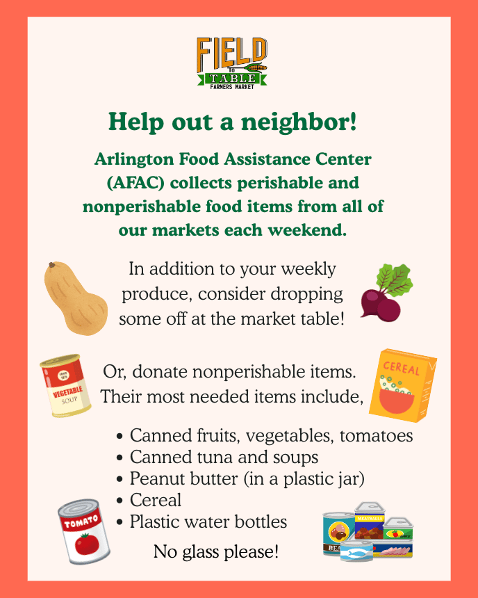 Field to Table has partnered with the Arlington Food Assistance Center (AFAC) to have donation boxes available each week at all farmers markets. Support the Arlington community by donating nonperishable food items (no glass, please) at our markets. Learn more.
