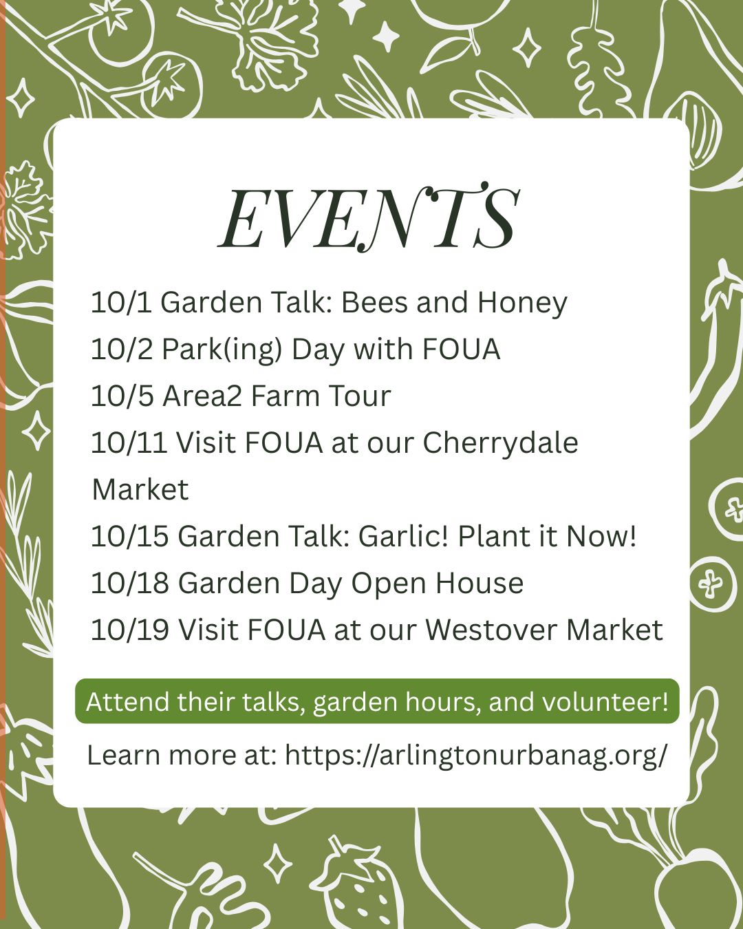 Check out these opportunities to learn more about Urban Agriculture in Arlington, hosted by Arlington Friends of Urban Agriculture (FOUA)!