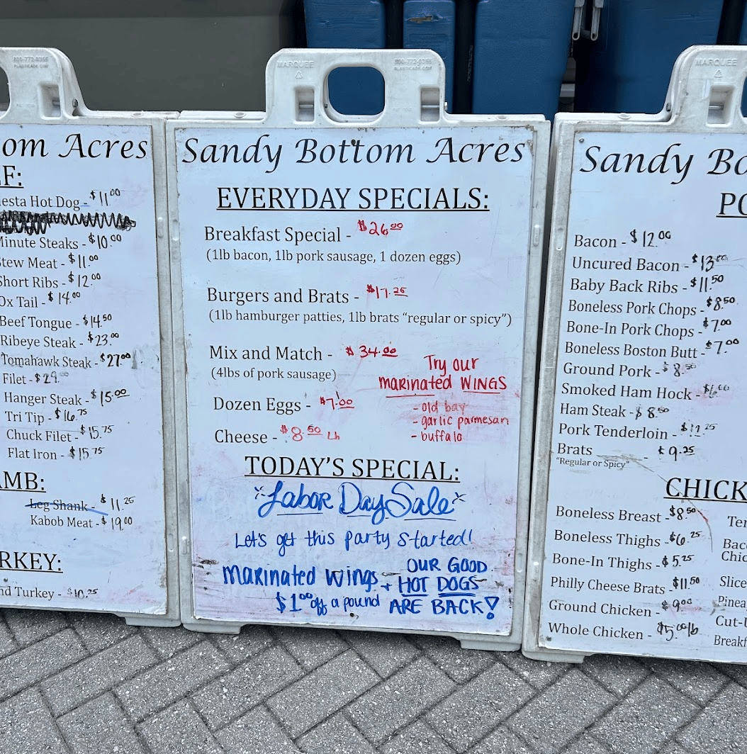 Visit Sandy Bottom Acres for cuts of beef, lamb, chicken, sausage and more! Check them out on Facebook!