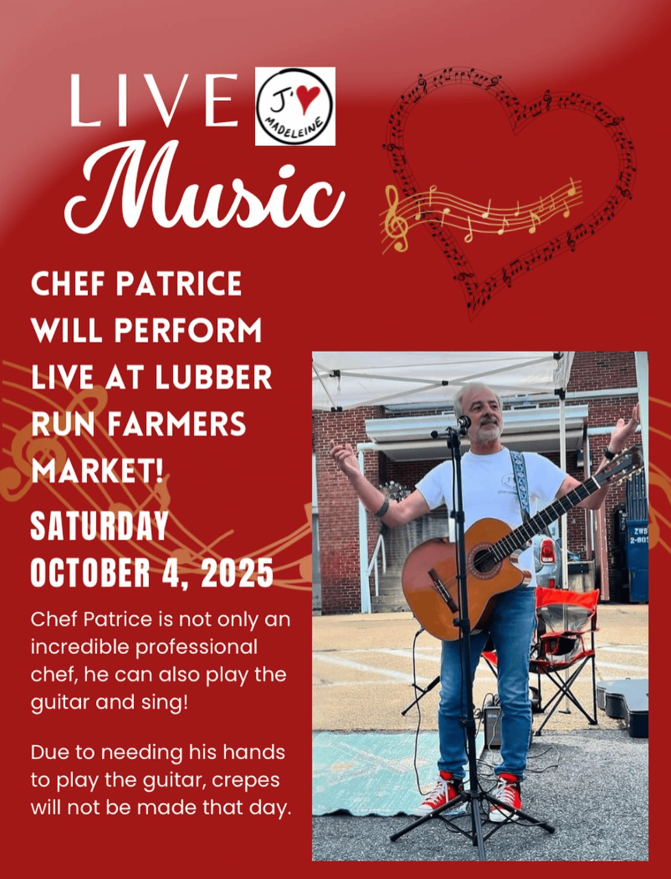 Due to his using his hands to play the guitar, there will be no crepes at the market this weekend!