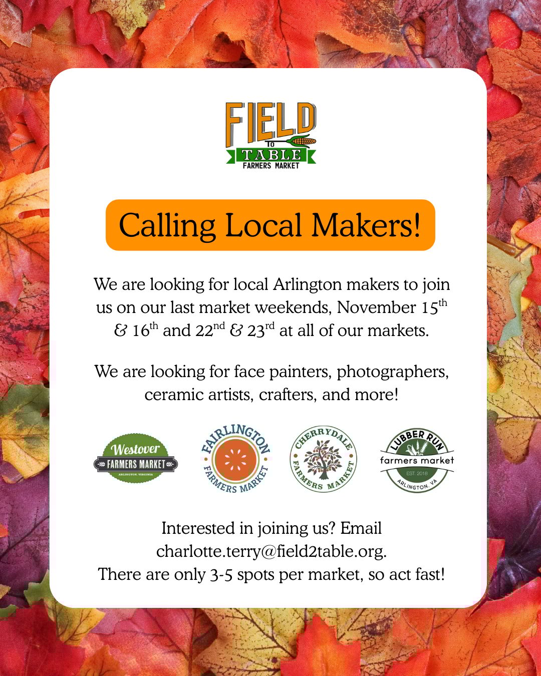 Field to Table hosts four local farmers markets in the Arlington, Virginia area that provide goods grown, harvested, or produced within 125 miles of the markets. We are committed to providing fresh, high-quality products while facilitating a welcoming community atmosphere.
