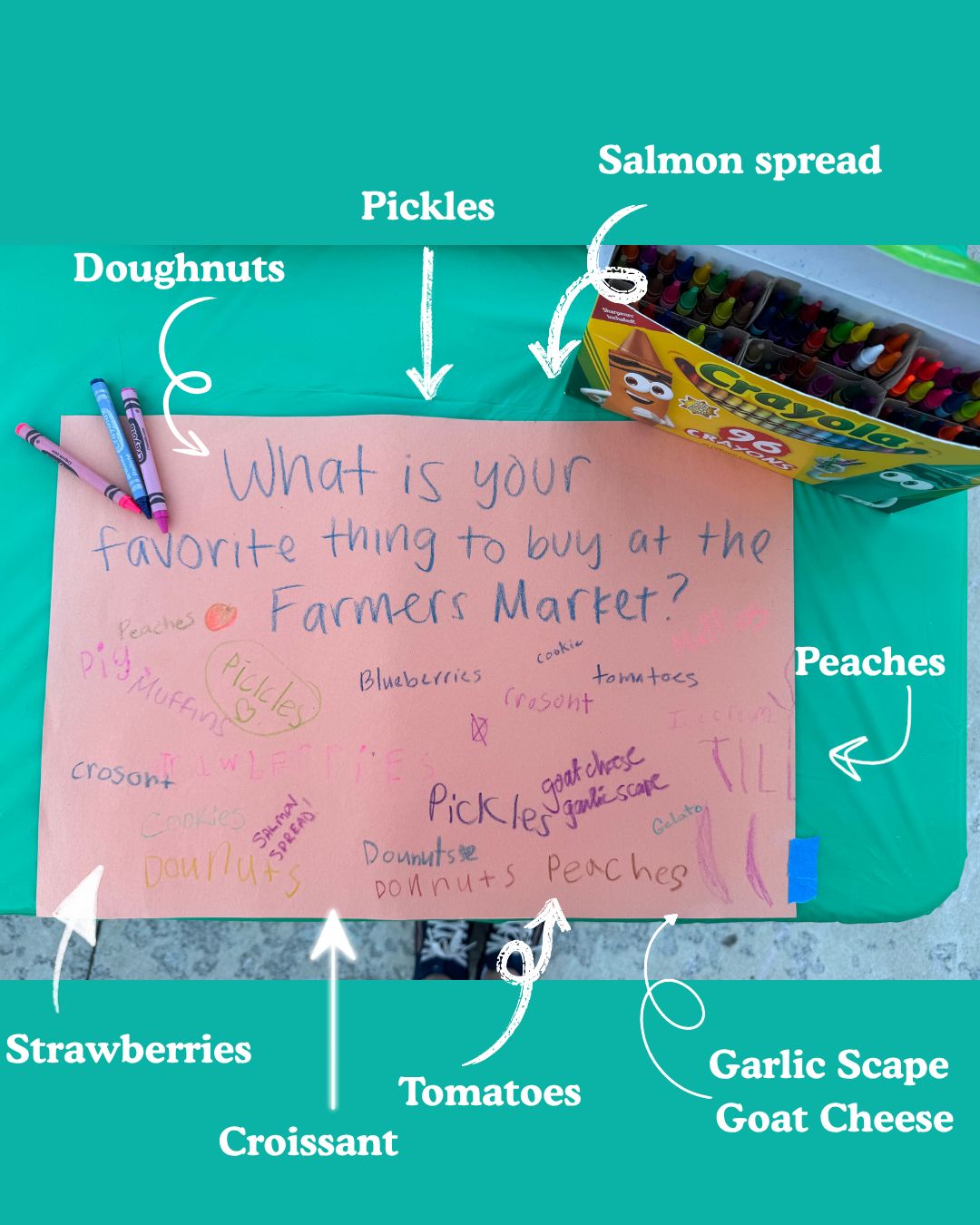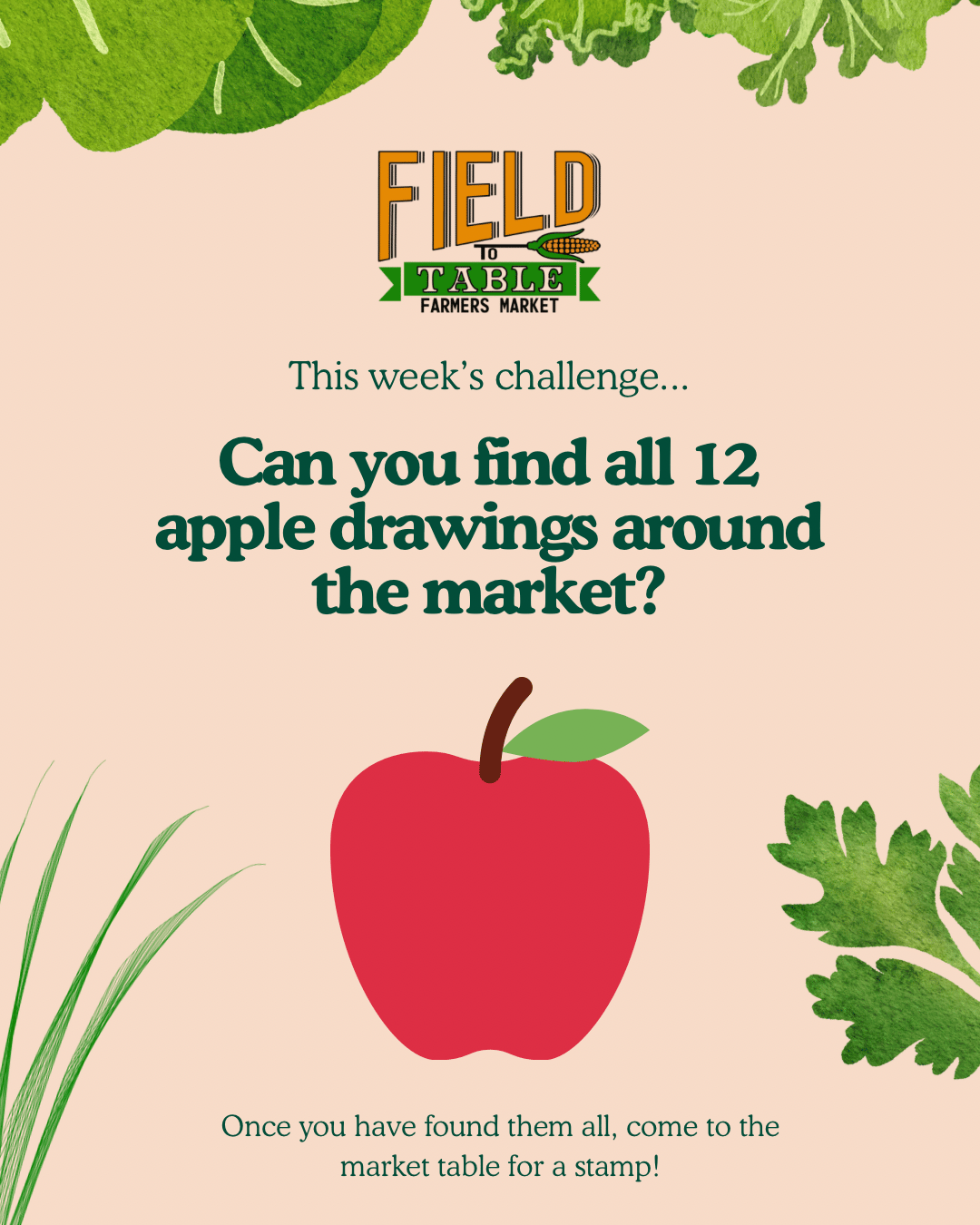 Each week, we post a challenge for you all to find chalk drawings of fruits or veggies scattered around the market. Find all of them, and come to the market table for a stamp on your punch card (provided there). Once you get 6 stamps (you get one per week), you get a prize!